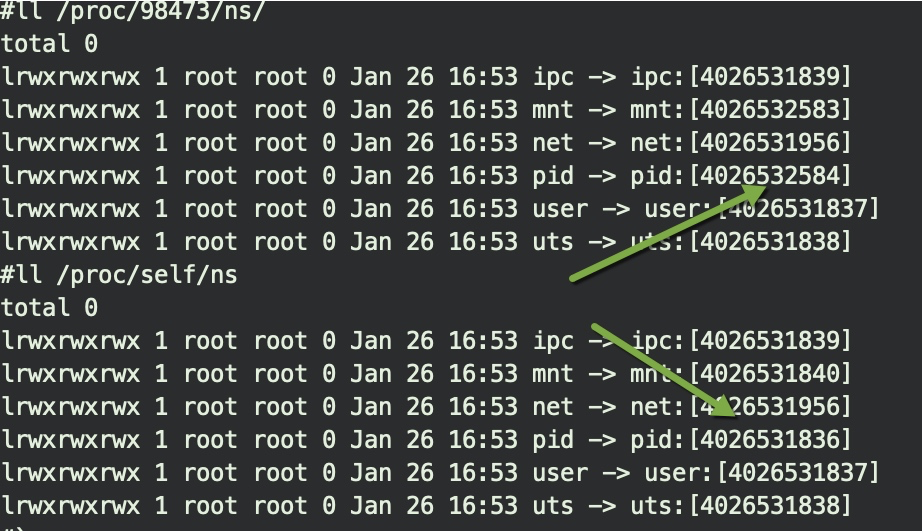 接下来,在宿主机上,把sleep对应进程的命名空间信息,和宿主机的命名空间信息作一下对比。可以看到,它们的pid namespace,对应的数值是不同的。