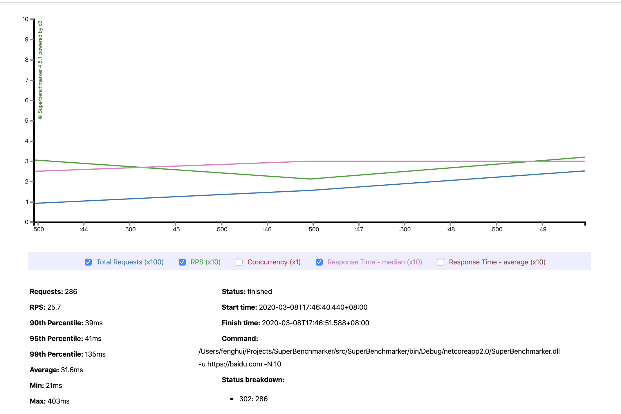dotnet ./src/SuperBenchmarker/bin/Debug/netcoreapp2.0/SuperBenchmarker.dll -u https://baidu.com -N 10