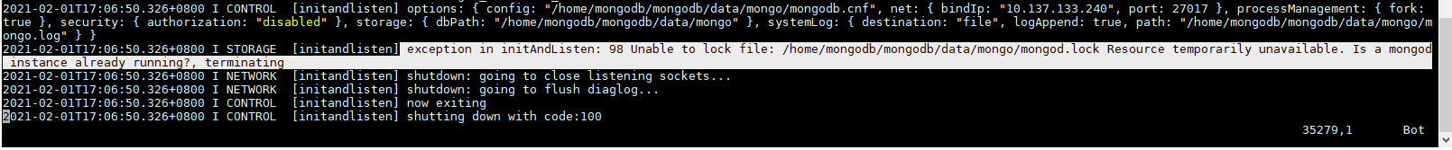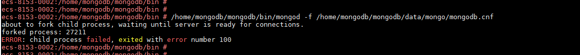 今天启动mongodb的时候,出现报错:ERROR: child process failed, exited with error number 100
