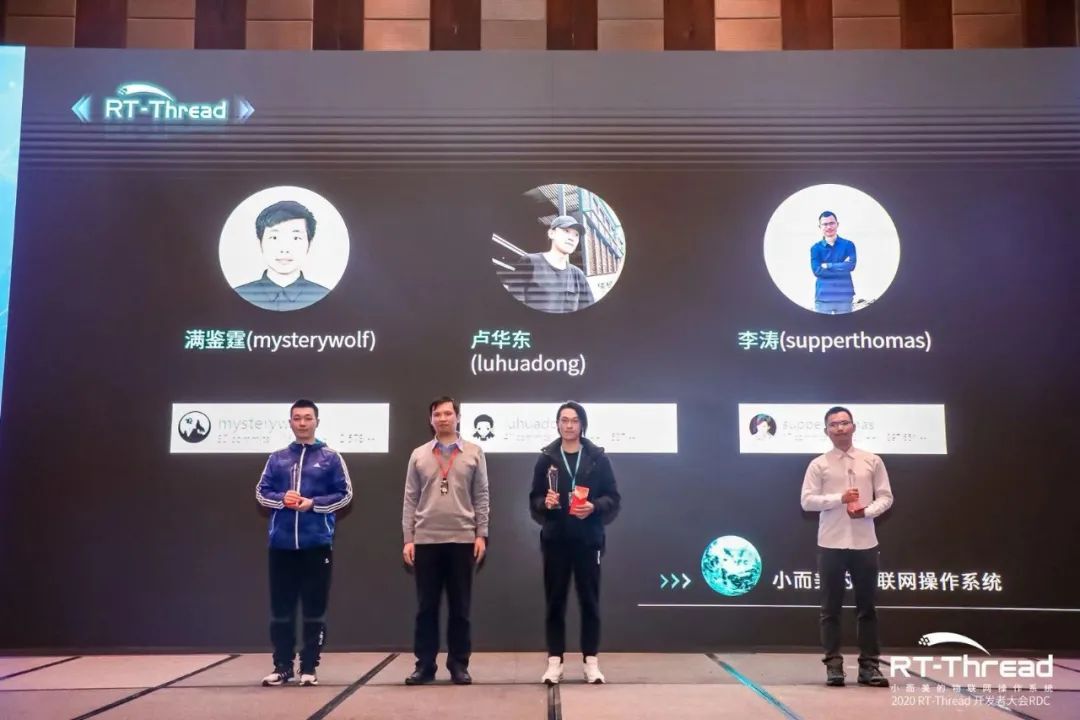 2020 RT-Thread 年度开发者大会在深圳举行,我也受邀参加了,有幸跟各位大佬聚餐交流。和满老师、涛哥一起荣获 2020 RT-Thread 社区杰出贡献奖,非常开心~ 我知道社区里有许许多多优秀的开发者,也知道自己还有很多需要提升的地方,所以真的非常感谢社区伙伴的支持和 RT-Thread 团队的肯定。我会继续加油的,在为中国基础软件产业做贡献的同时提升自己,成就彼此。