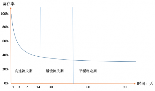 一般用户留存会经历三个阶段,即高速流失期、缓慢流失期、平缓稳定期。