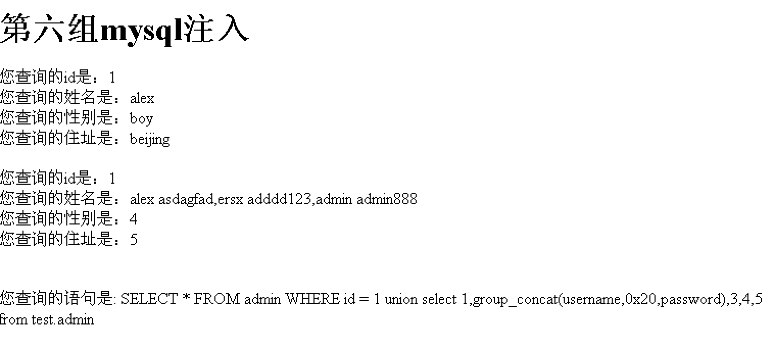 group_concat()函数的作用是 将相同的行组合起来 语法:group_concat( [DISTINCT] 要连接的字段 [Order BY 排序字段 ASC/DESC] [Separator '分隔符'] ) 具体用法需查询,这里并不需要