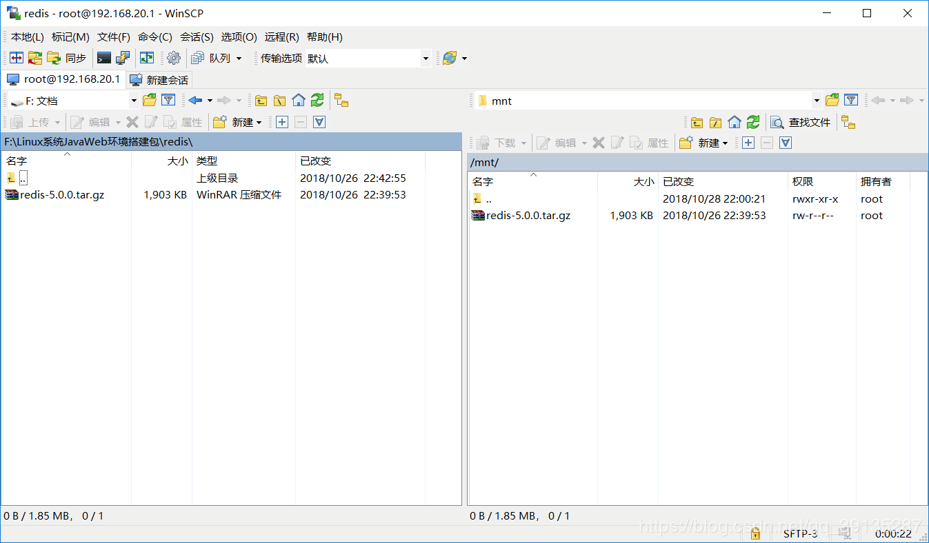2、下载完成之后,打开WinSCP,把我们下载好的Redis压缩包,上传到Linux的 /mnt/ 文件目录下