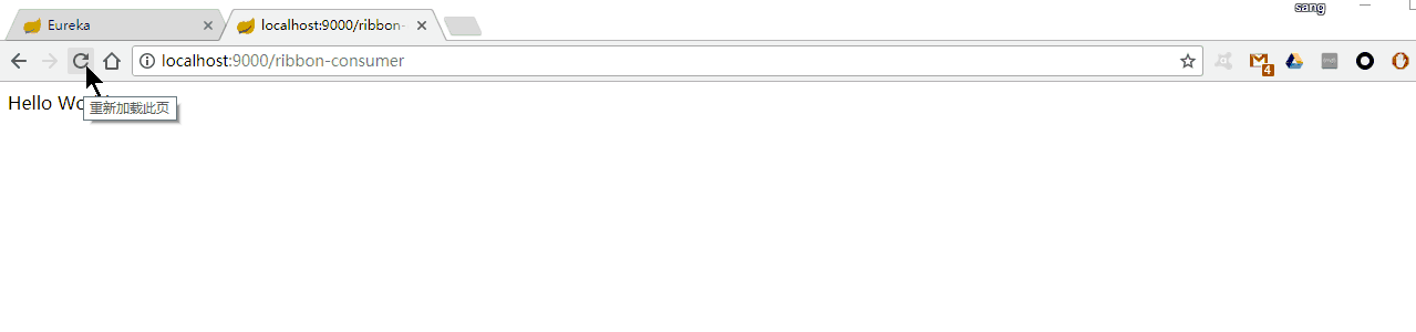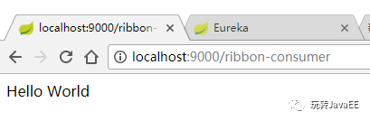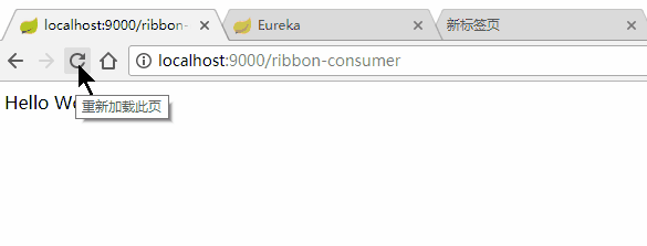 首先我们分别启动服务注册中心,再启动两个服务提供者的实例,端口号分别是8080和8081,然后再启动一个服务消费者,服务消费者的端口号为9000,这几个都启动成功之后,我们访问http://localhost:9000/ribbon-consumer这个地址,可以看到如下效果: