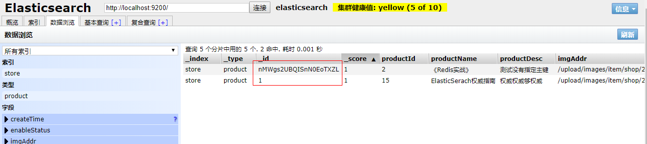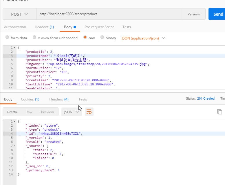 其中store表示Index,product表示Type,数字1表示的是Document(文档)的主键,主键可以是任意的形式,也可以不指定主键,Elasticsearch将会自动生成一个唯一主键,但是必须是post方式提交请求。