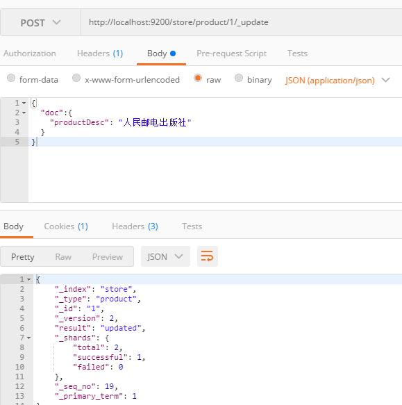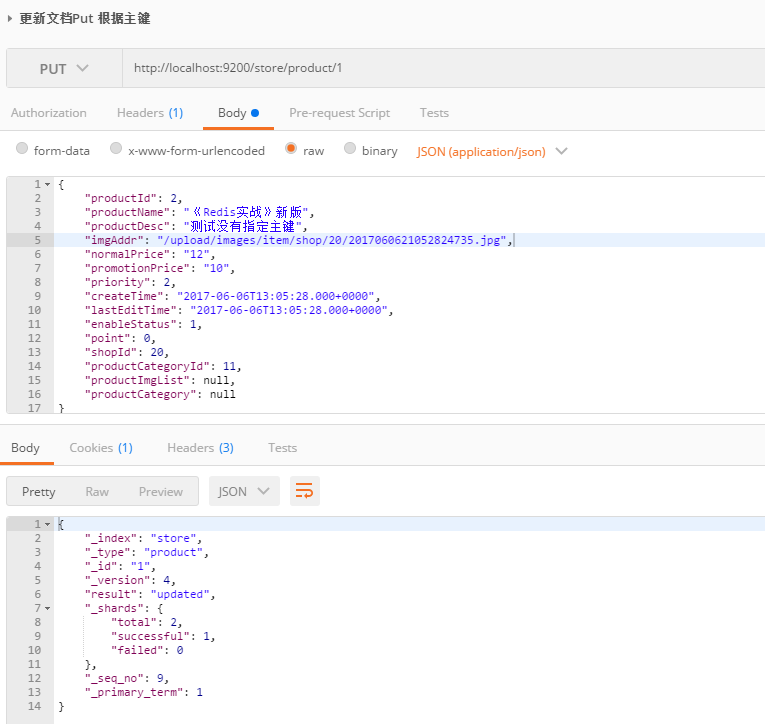 PUT方式:http://localhost:9200/store/product/1 //指定id,存在则更新,不存在则新增