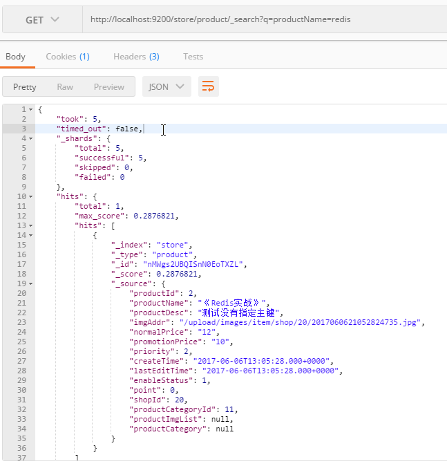 GET方式:http://localhost:9200/store/product/nMWgs2UBQISnN0EoTXZL Elasticserach提供的是restful api,很容易理解这个接口形式。