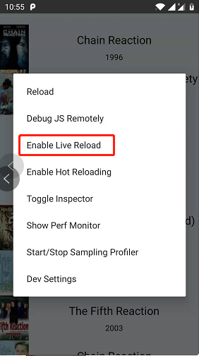 2:当我们在Android真机上运行项目时,想要热加载的话,我们需要摇晃手机,并选取enable live Reload选项