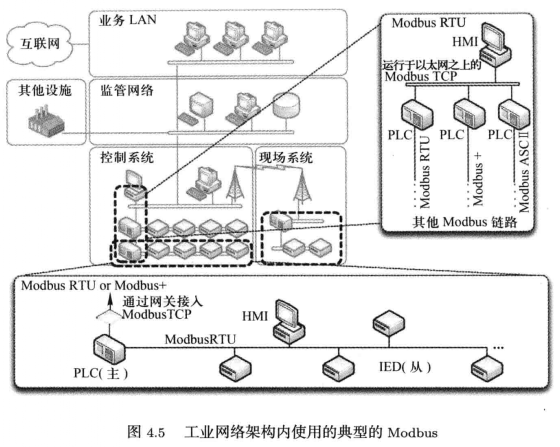 Modbus协议: 非常适合作为PLC 和RTU与SCADA系统间传递监控数据的协议。经常部署在PLC与HMI之间,或者PLC与从设备之间。