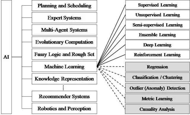 人工智能的研究领域也在不断扩大,图二展示了人工智能研究的各个分支,包括专家系统、机器学习、进化计算、模糊逻辑、计算机视觉、自然语言处理、推荐系统等。