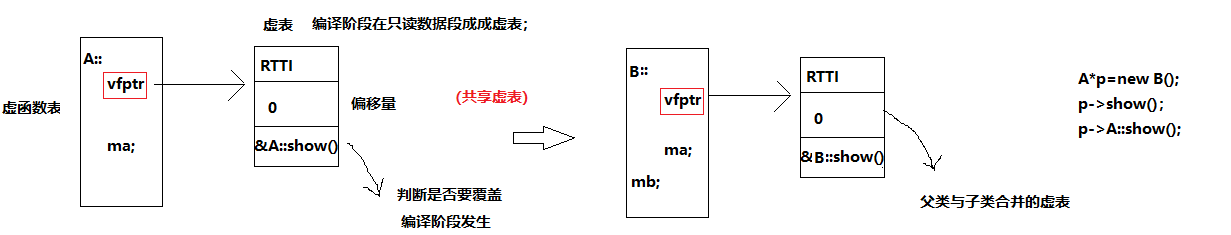 virtual 虚函数,编译阶段,类中多了一个vfptr指针指向vftable(虚表,存放虚函数的入口地址)若基类中的函数是虚函数,则派生类中同名同参的函数也是虚函数(系统自动添加)