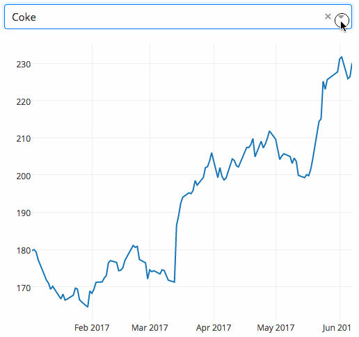 下面是一个下拉式菜单,可以选择股票代码的pandas Dataframe数据类型作为输入,渲染成动态交互的折线图