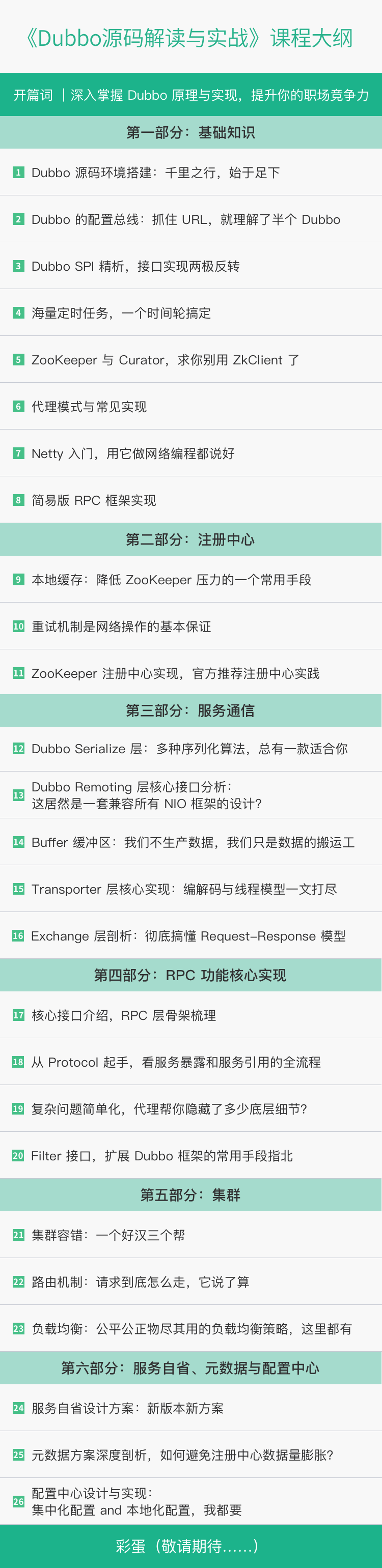 讲师的口碑和能力当然不是我推荐这个课的原因,主要看内容,和市面上 Dubbo 学习资料相比,这个课程的设计是高出一筹的。