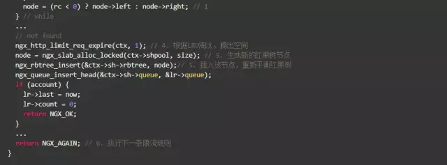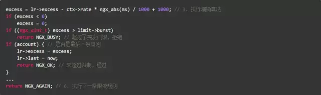上述代码受限算出当前key上遗留的请求数,如果超过了burst,就直接拒绝;由于Nginx允许多条限速规则同时起作用,如果已是最后一条规则,则允许通过,否则执行下一条规则。