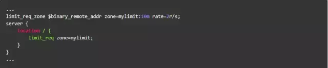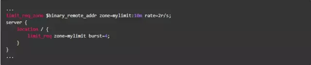 按请求速率限速是指限制单个IP(或者其他的key)发送请求的速率,超出指定速率后,Nginx将直接拒绝更多的请求。采用leaky bucket算法实现。为深入了解这个模块,我们先从实验现象说起。开始之前我们先简单介绍一下该模块的配置方式,以下面的配置为例:
