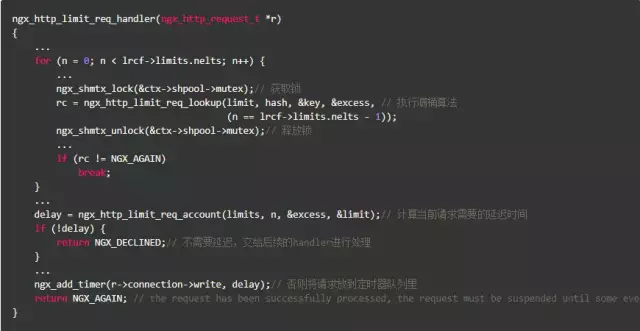 我们看到ngx_http_limit_req_handler()调用了函数ngx_http_limit_req_lookup(),并根据其返回值决定如何操作:或是拒绝,或是交给下一个handler处理,或是将请求放入定期器队列。当限速规则都通过后,该hanlder通过调用函数ngx_http_limit_req_account()得出当前请求需要的延迟时间,如果不需要延迟,就将请求交给后续的handler进行处理,否则将请求放到定时器队列里。注意这个定时器队列是共享的,并没有为单独的key(比如,每个IP地址)设置队列。