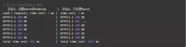 我们加入了burst=4,意思是每个key(此处是每个IP)最多允许4个突发请求的到来。如果单个IP在10ms内发送6个请求,结果会怎样呢?