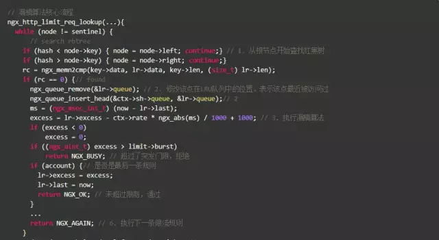 漏桶算法的实现也比我们想象的简单,其核心是这一行公式excess = lr->excess - ctx->rate * ngx_abs(ms) / 1000 + 1000,这样代码的意思是:excess表示当前key上遗留的请求数,本次遗留的请求数 = 上次遗留的请求数 - 预设速率 X 过去的时间 + 1。这个1表示当前这个请求,由于Nginx内部表示将单位缩小了1000倍,所以1个请求要转换成1000。