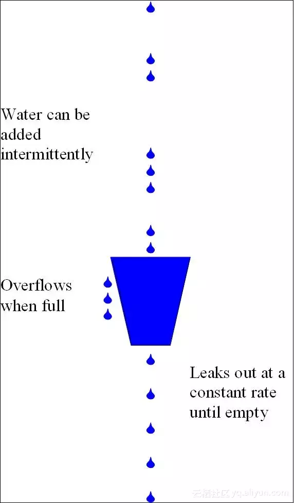 来不及流出的水存在水桶中(缓冲),以固定速率流出;