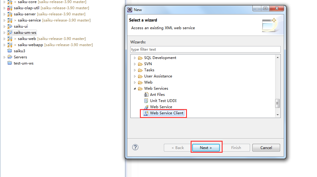 右击新建的羡慕 saiku-um-ws --> new --> others --> 选中下图中的 Web Service Client --> 点击 next