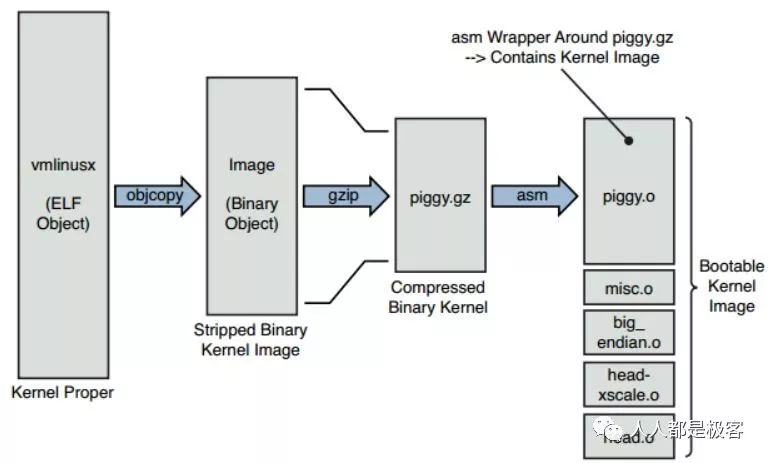 (5)最后 piggy.o 文件和 Bootstrap Loader 组成一个 Bootable Kernel Image 文件(可启动文件)。