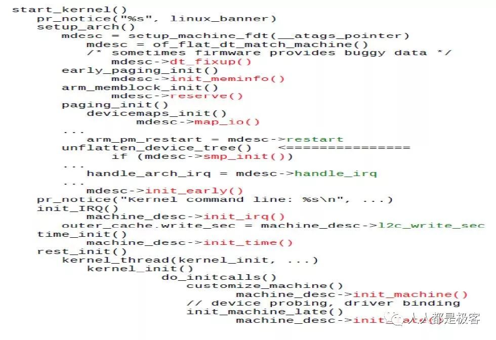 关于 start_kernl() 函数的内容太多,可以通过红色回调函数看出,start_kernel() 函数基本是在回调很多对应的注册函数。为了本系列课程的结构性这里就不展开所有知识点讲解,本篇内容接着前一篇设备树的内容重点讲解下设备和驱动的匹配过程。