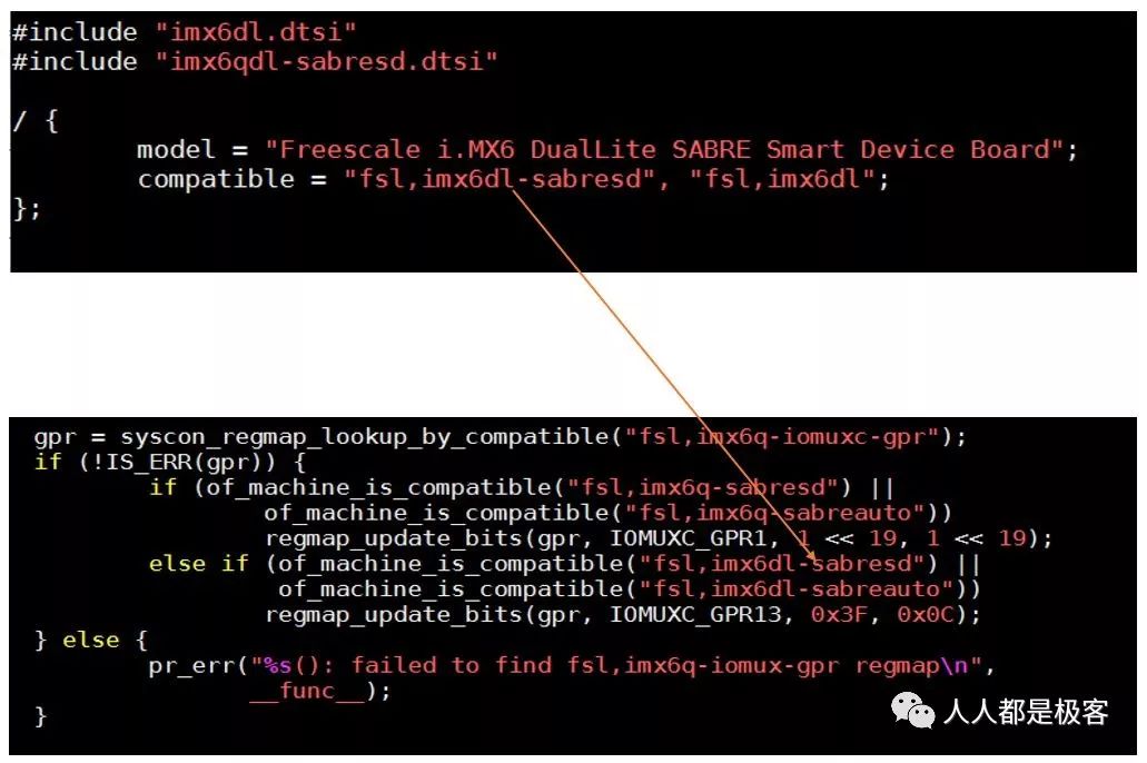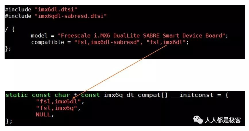 这里补充一个知识点,细心的读者也许发现了在 Compatible 字段里用逗号分隔了两个字符串。板级匹配的时候用的是哪个字符串,另外一个字符串又是做什么用?首先后面的字段 "fsl,imx6dl" 是抽象共用平台描述符,前面的字段 "fsl,imx6dl-sabresd" 是通用平台下的具体平台描述符,可以理解为母板和子板的区别。在具体的子板文件中我们可以通过前面的字段进行设备信息的获取,如图: