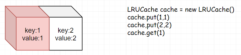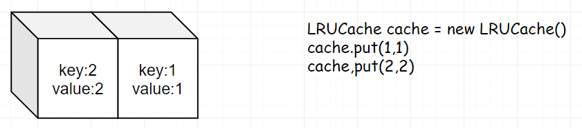 第二步:我们分别向cache里边put(1,1)和put(2,2),这里因为最近使用的是2(put也算作使用)所以2在前,1在后。