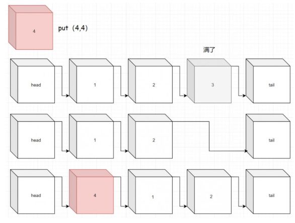 第五步:我们继续put(4,4),同理我们将1作废。此时如果get(1),也是返回-1。