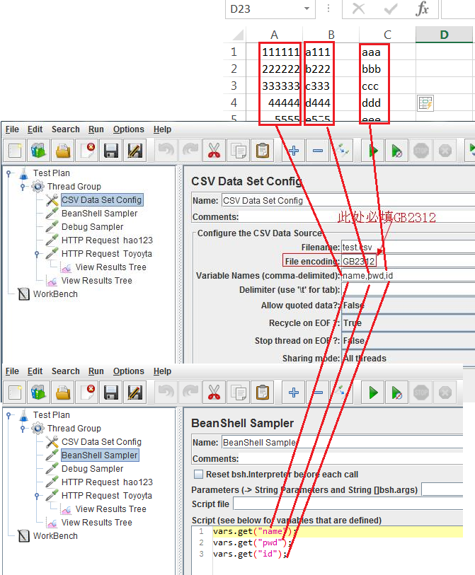 jmeter 读取excel数据使用的方法是使用Jmeter CSV Data Set Config参数化