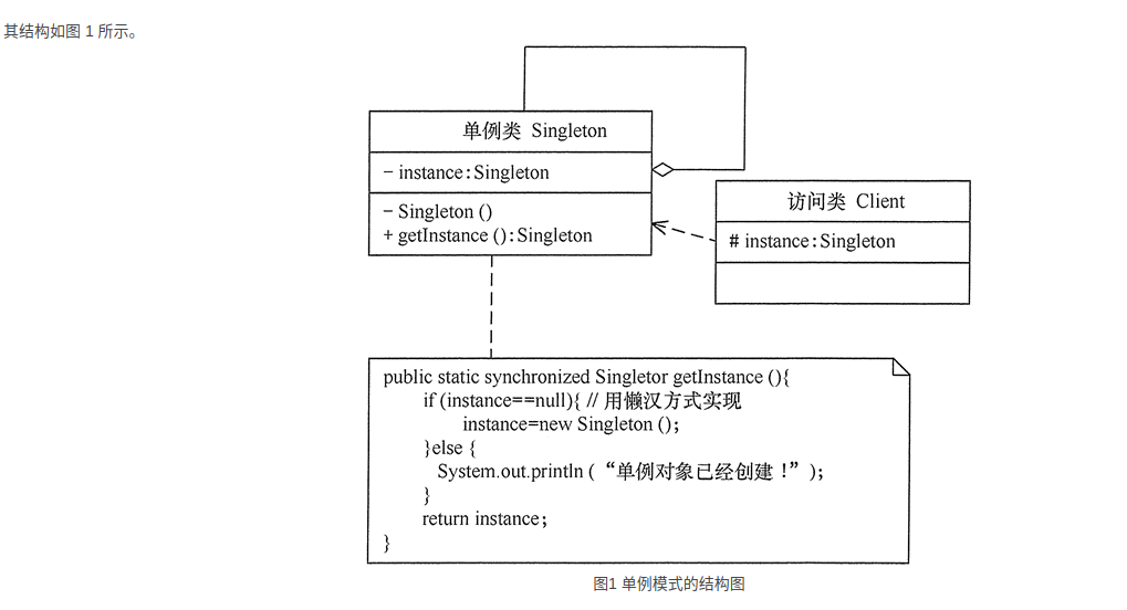注意:如果编写的是多线程程序,则不要删除上例代码中的关键字 volatile 和 synchronized,否则将存在线程非安全的问题。如果不删除这两个关键字就能保证线程安全,但是每次访问时都要同步,会影响性能,且消耗更多的资源,这是懒汉式单例的缺点。