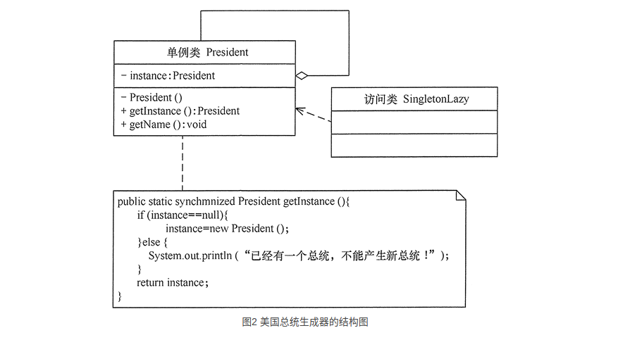分析:在每一届任期内,美国的总统只有一人,所以本实例适合用单例模式实现,图 2 所示是用懒汉式单例实现的结构图。