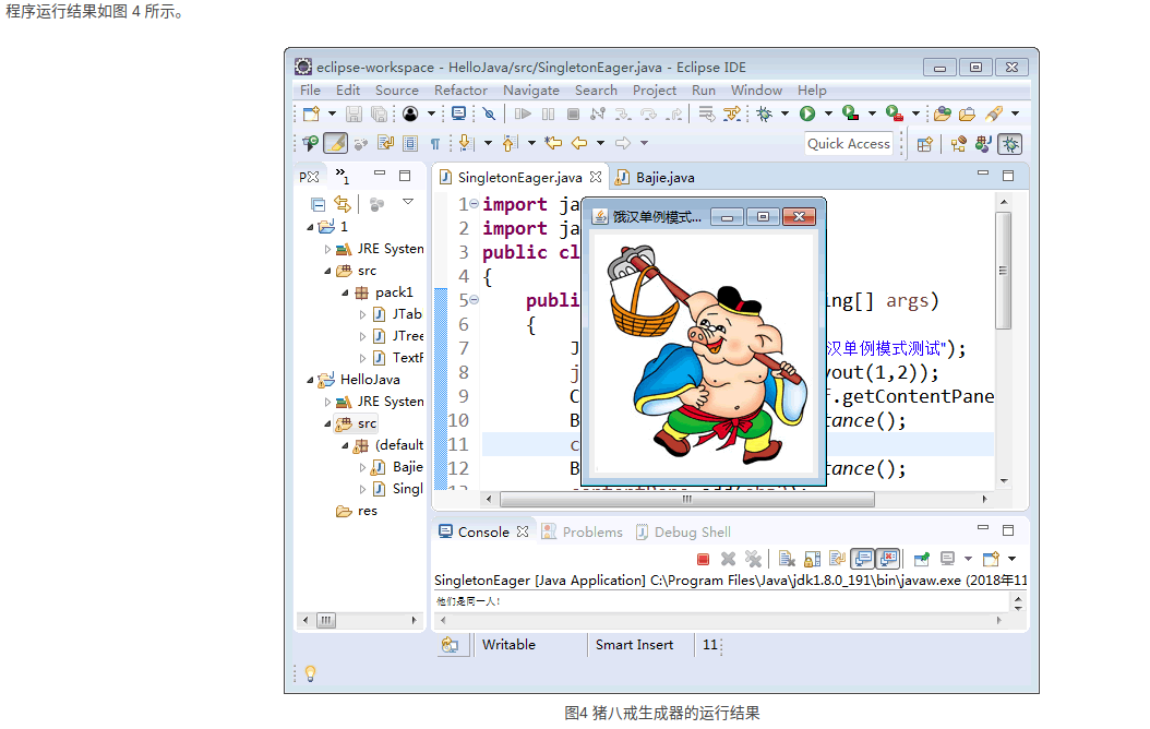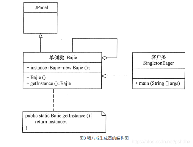 分析:同上例类似,猪八戒也只有一个,所以本实例同样适合用单例模式实现。本实例由于要显示猪八戒的图像(点此下载该程序所要显示的猪八戒图片),所以用到了框架窗体 JFrame 组件,这里的猪八戒类是单例类,可以将其定义成面板 JPanel 的子类,里面包含了标签,用于保存猪八戒的图像,客户窗体可以获得猪八戒对象,并显示它。图 3 所示是用饿汉式单例实现的结构图。