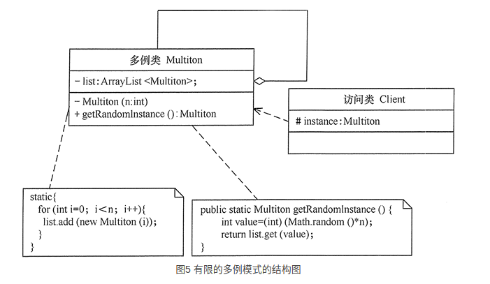 单例模式可扩展为有限的多例(Multitcm)模式,这种模式可生成有限个实例并保存在 ArrayList 中,客户需要时可随机获取,其结构图如图 5 所示。