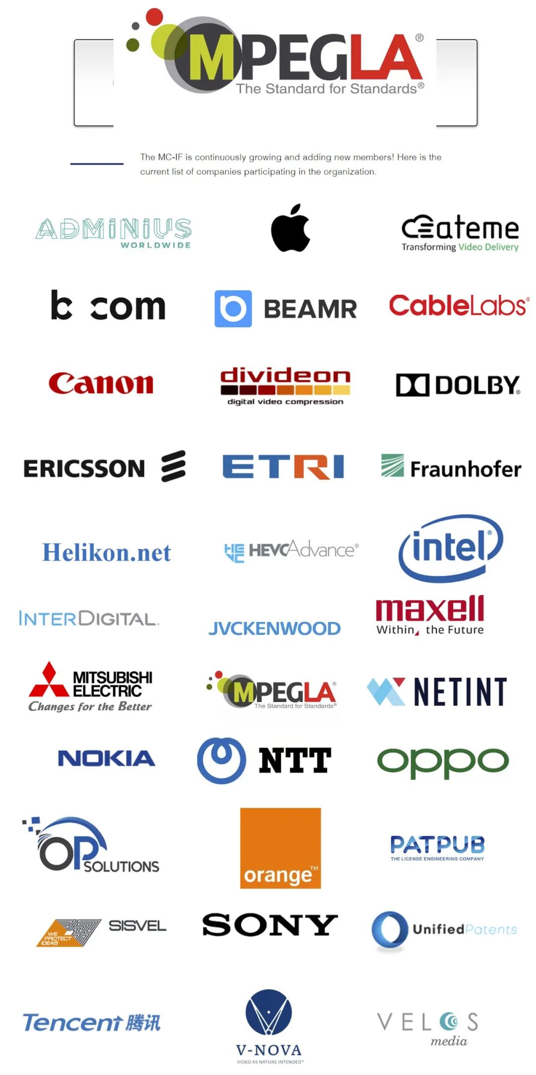 根据MC-IF官网公布的成员名单显示,HEVC Advance、MPEG LA、Velos、Sisvel专利池都在名单之中,其中前三者是HEVC的三个专利池。同时,包括腾讯、OPPO、NETINT等也在成员之中。