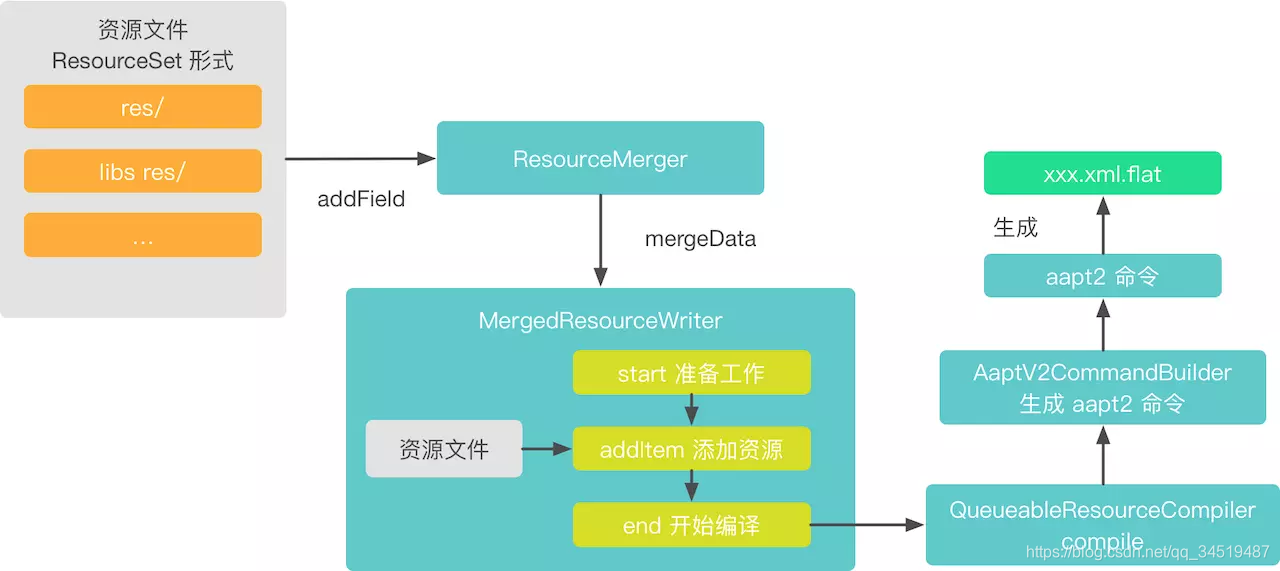 - 调用 QueueableAapt2 -> Aapt2QueuedResourceProcessor -> AaptProcess 处理资源,这一步调用 aapt2 命令去处理资源,处理完以后 xxx.xml.flat 格式