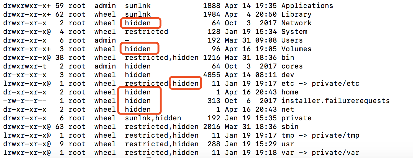 这是通过BSD的系统调用chflags设置了一个特殊的文件属性"hidden",这跟属性控制文件是否从GUI视图中隐藏。