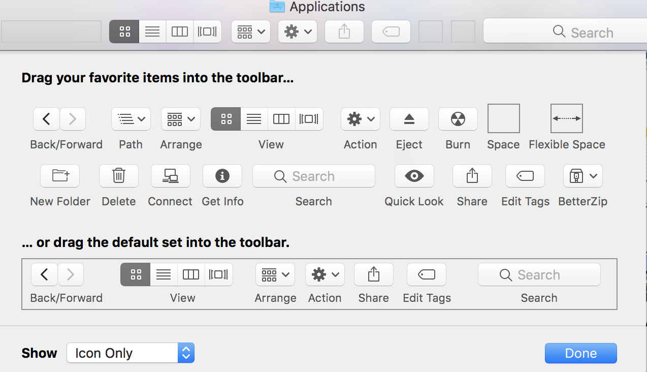 finder、safari等等的软件,如果对默认工具栏不满意,都是可以定制的,右击选择自定义,将工具拖入或拖出。