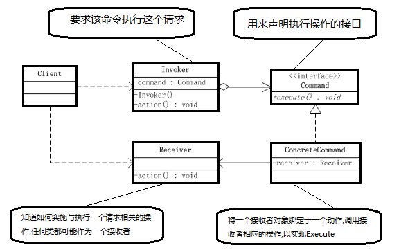 Command(抽象命令类):抽象出命令对象,可以根据不同的命令类型。写出不同的实现类。