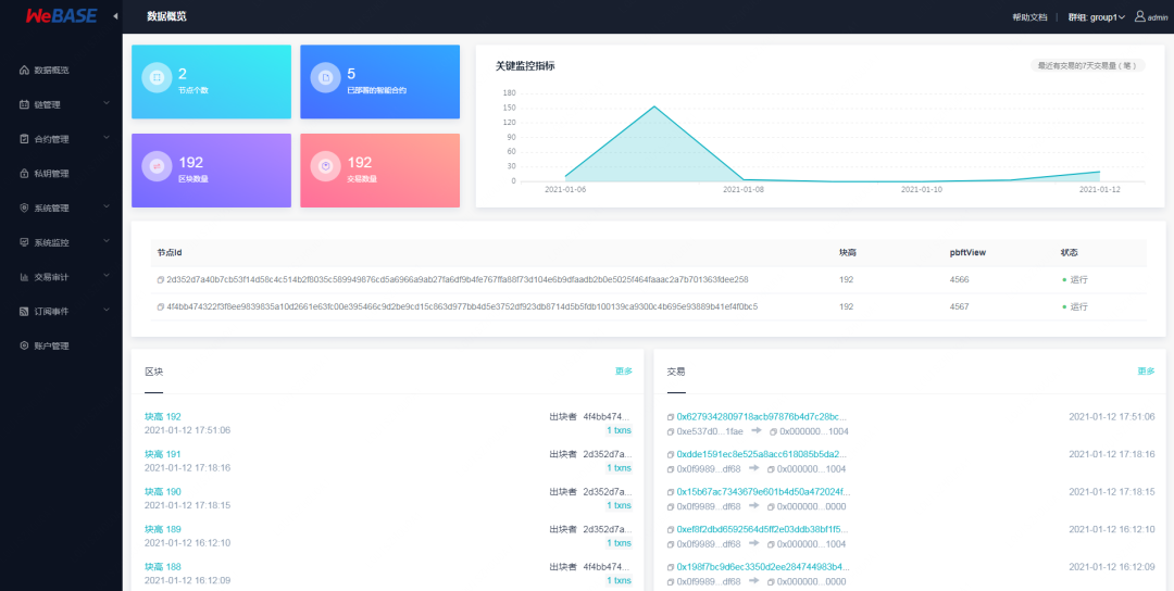 WeBASE是一个体验友好、功能丰富的区块链中间件平台,通过一系列通用功能组件和实用工具,助力开发者快速搭建区块链应用的基础环境,并提供可视化合约IDE和一站式联盟链管理台。