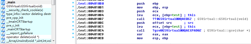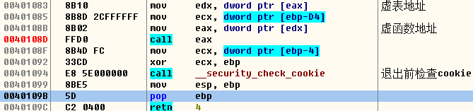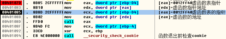 因为源代码在类函数里调用了虚函数,所以在类函数中会有一个从虚函数表中寻找虚函数地址的过程,并且在退出前检查cookie的值: