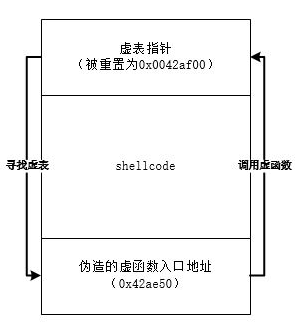 我们的目标是把虚表指针中的虚函数指针地址换成我们shellcode指针的地址,把虚函数指针换成恶意代码的指针。