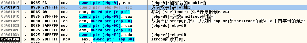 恶意代码的指针==0x0012fe64,在执行strcpy的时候,0x0012fe54中存放的值是0x0012fe64(i中的代码执行截图里可以看到)。