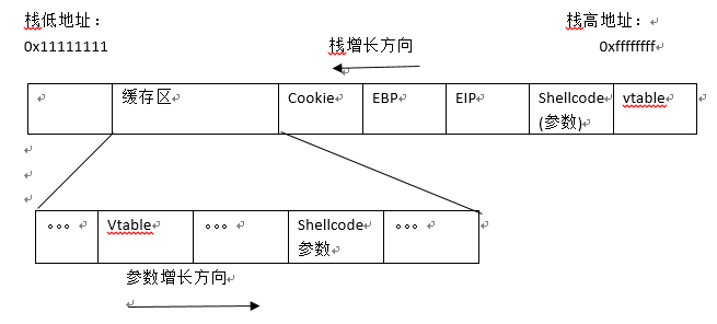 由图1-3和2-4可知,函数中的buf变量发生溢出的时候有可能影响虚表指针,如果可以控制虚表指针,将其指向我们shellcode,就可以在程序调用时控制程序的流程。