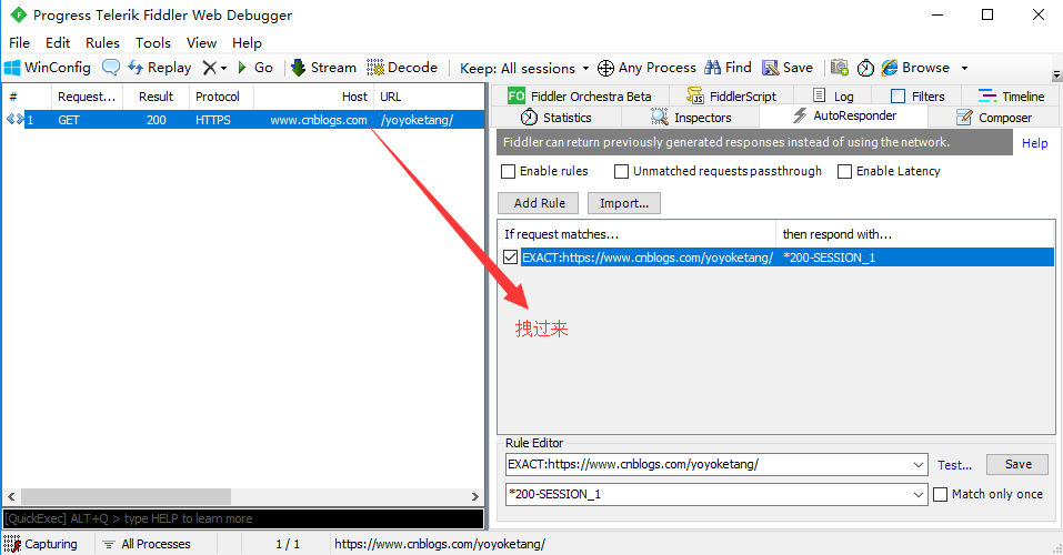 访问在线地址:https://www.cnblogs.com/yoyoketang/ 使用fiddler抓包 从会话框找到抓到的数据,拽到AutoResponder页面