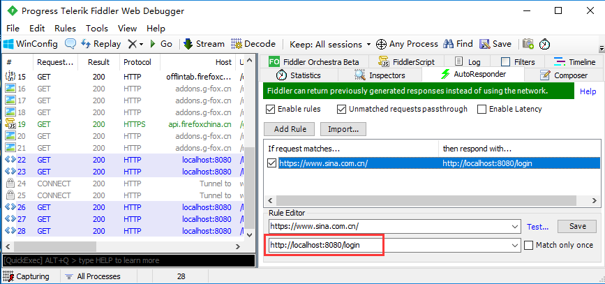 当访问一个外网地址的时候,如何跳转到本地的连接呢?在这里也可以设置规则跳转 如下图设置规则,访问https://www.sina.com.cn/时跳转到访问本地的jenkins地址http://localhost:8080/login