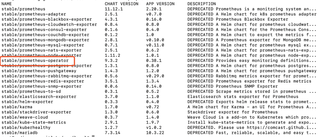 在具体安装Prometheus-Operator之前,我们先用“helm”命令搜索Prometheus相关的charts包,命令如下: