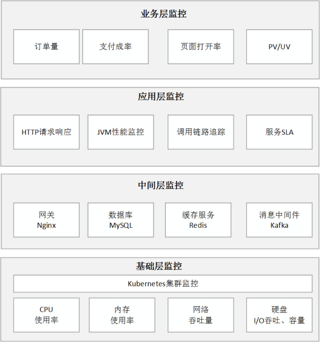 在实际场景中监控系统按照监控的对象及系统层次结构,从底向上可以依次划分为基础层、中间层、应用层、业务层等多个层面的监控。具体可如图所示: