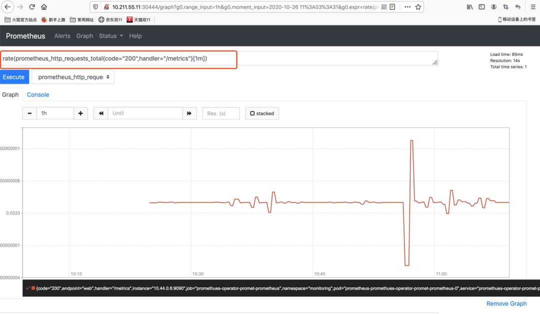 此时就可以看到Promethues内置的监控可视化界面了,效果如下图所示: